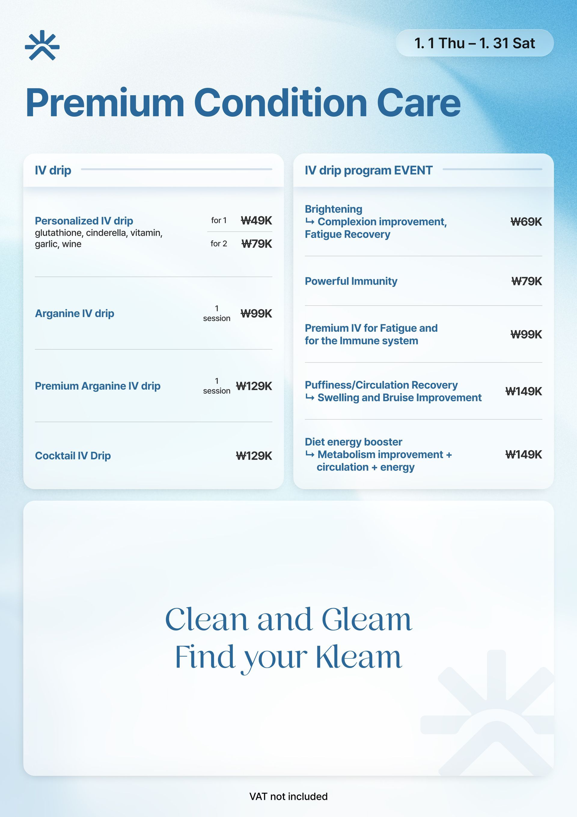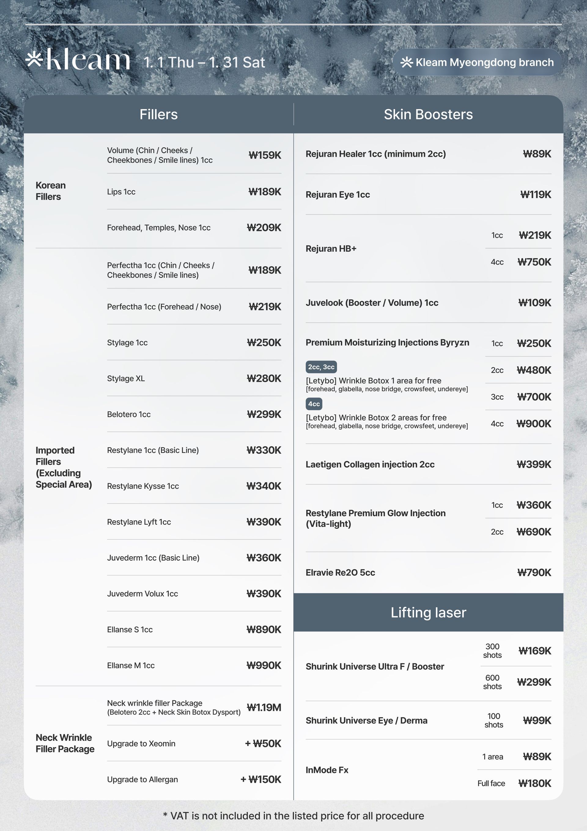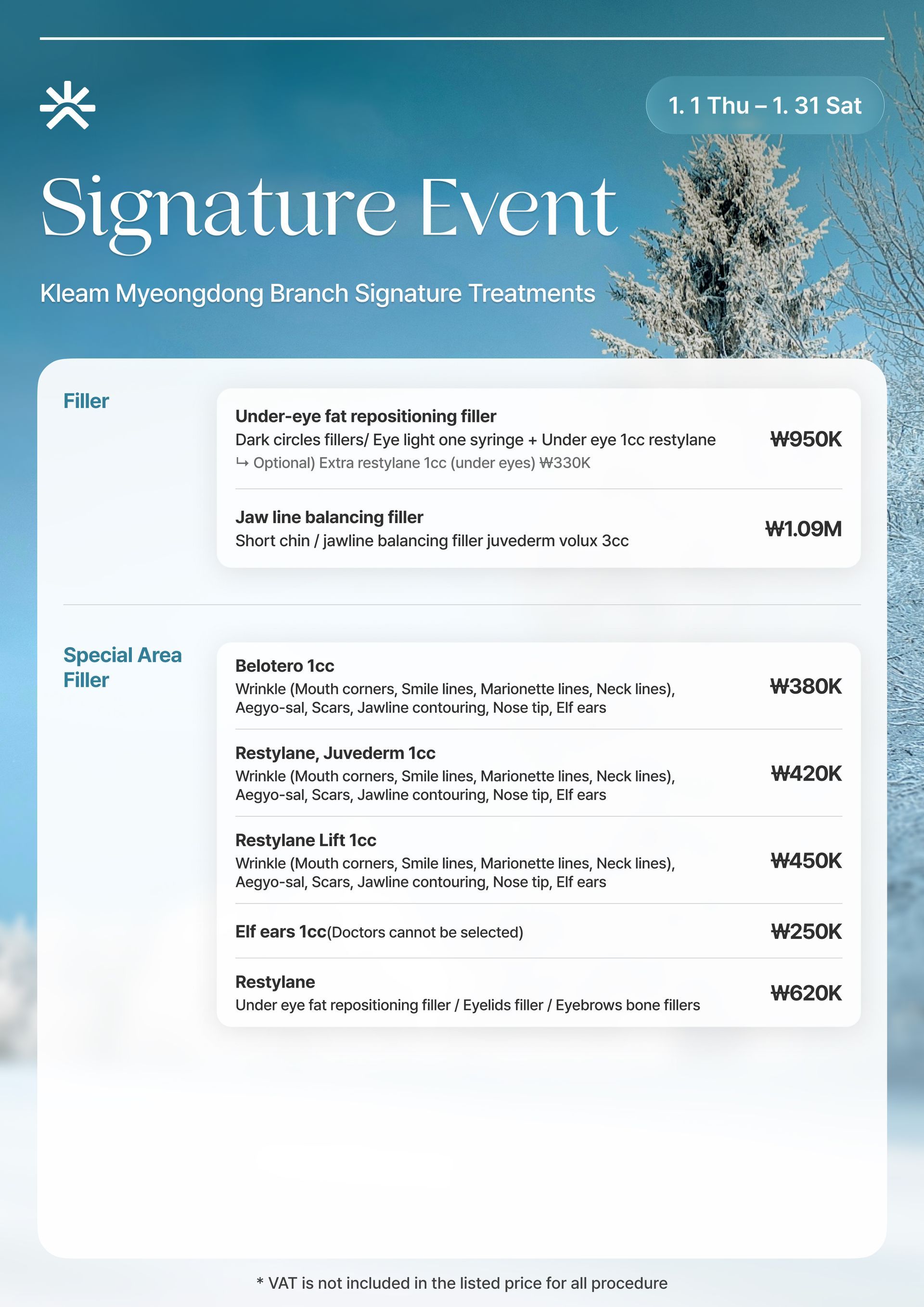 Skinvive, Radiesse, Waterglow Injection, Rejuran Healer, Q-Facial, LDM, Waterdrop Lifting Peel, Mall DM.Cell, Skin Plus Ampoule, Exosome (G-MPF), Lilied M, Juvelook, Chanel Injection, Aqua Shine BTX, Vital Injector 2, Dermashine Balance, Skinbooster Pro, Shining Peel, Oxygen Dome Facial, LED Light Therapy, Calming Care Facial, Hydration Infusion Therapy, Brightening Facial, Sebum Control Facial, Pore Tightening Booster, Moisture Glow Shot, Glutathione IV, Vitamin C Drip, Anti-aging Cocktail Drip, MTS + Ampoule Facial, Gua Sha Facial, High-Frequency Facial, Acne Peel, Enzyme Peel, Milk Peel, Mandeli Clear Peel, Salmon DNA Booster, PolyNucleotide Therapy, 5GF Ampoule Therapy