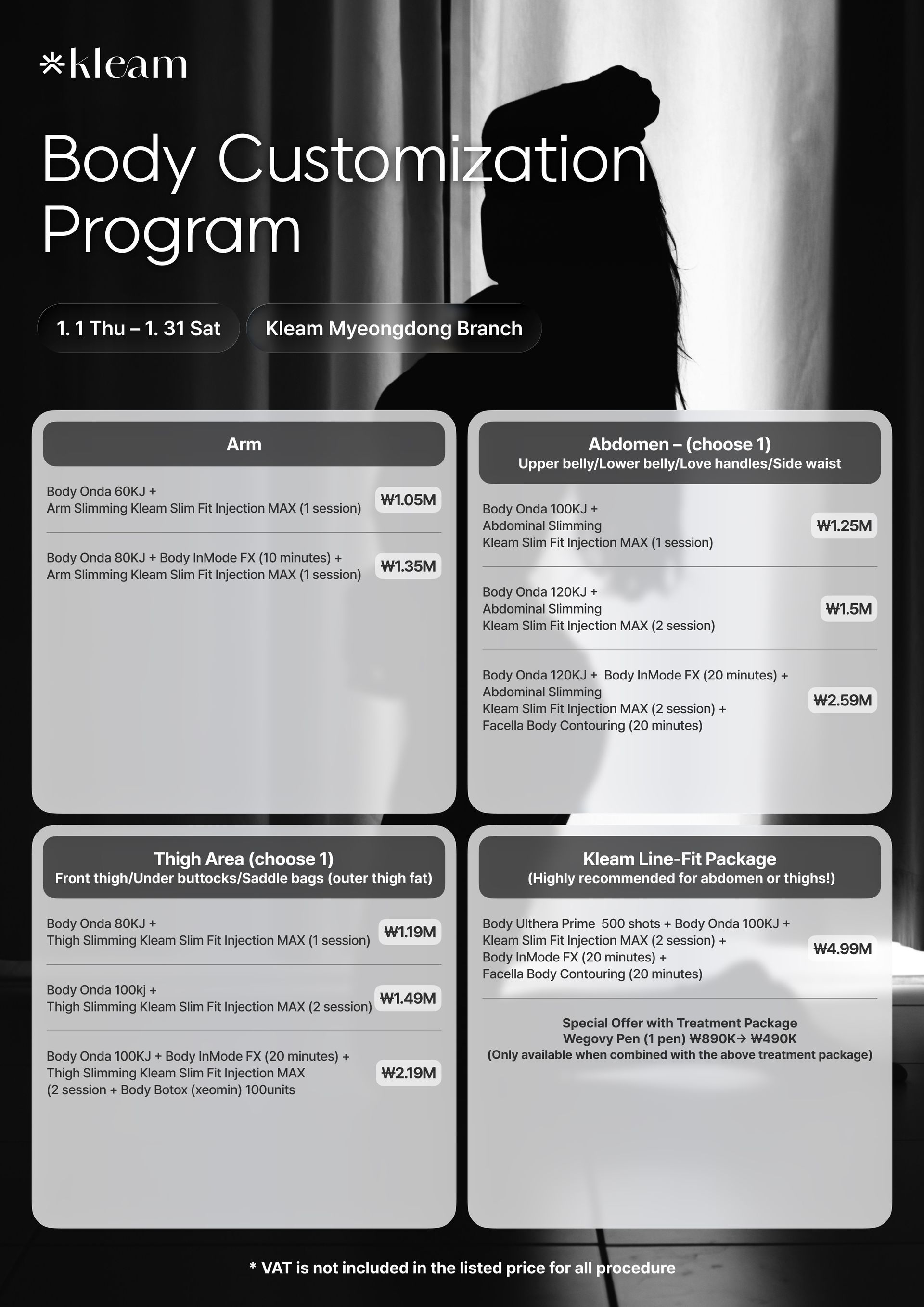 SS Injection, SlimCut, Botox for Sweating (Hyperhidrosis), Calf Contouring Injection, Calf PS Injection, Thigh Contouring Injection, Arm Contouring Injection, Abdomen Slimming Injection, Double Chin Injection, Fat-Dissolving Injection (Lipolysis), Cellulite Treatment, Exilis Body, CoolShaping, Lipocell, LipoCryo, Carboxy Therapy, HIFEM Body Sculpting, EMSculpt NEO, Accent Prime, Body Radiofrequency, Love Handle Reduction, Bra Bulge Reduction, Inner Thigh Lift, Knee Fat Injection, Shoulder Slimming Botox, Waistline Slimming Injection, Slim Jaw Injection, Backline Slimming, Muffin Top Contouring, 360 Body Line Injection