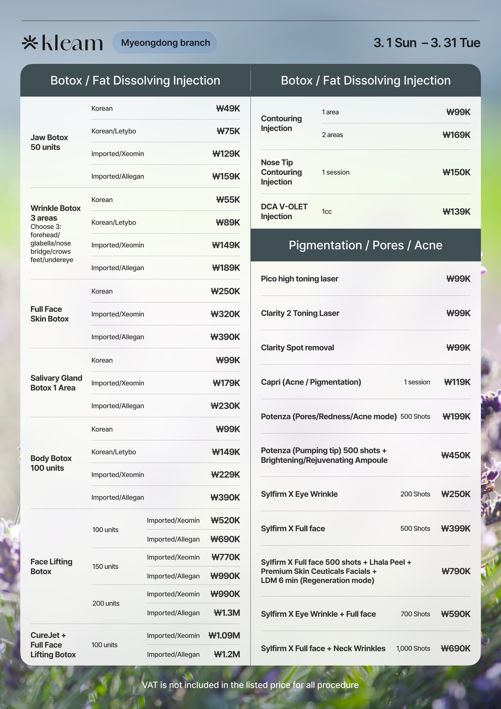 Kleam Clinic Myeongdong offers a variety of aesthetic treatments, including injectables such as Botox, Ellansé, and dermal fillers. For anti-aging and lifting, they provide services like Onda Lifting and Shurink. Their laser treatments include hair removal, acne scar treatments, and tattoo removal. The clinic also specializes in skin boosters like Rejuran Healer and body contouring procedures for areas like the calves and thighs. For more details, visit Kleam Skin Clinic Myeongdong.