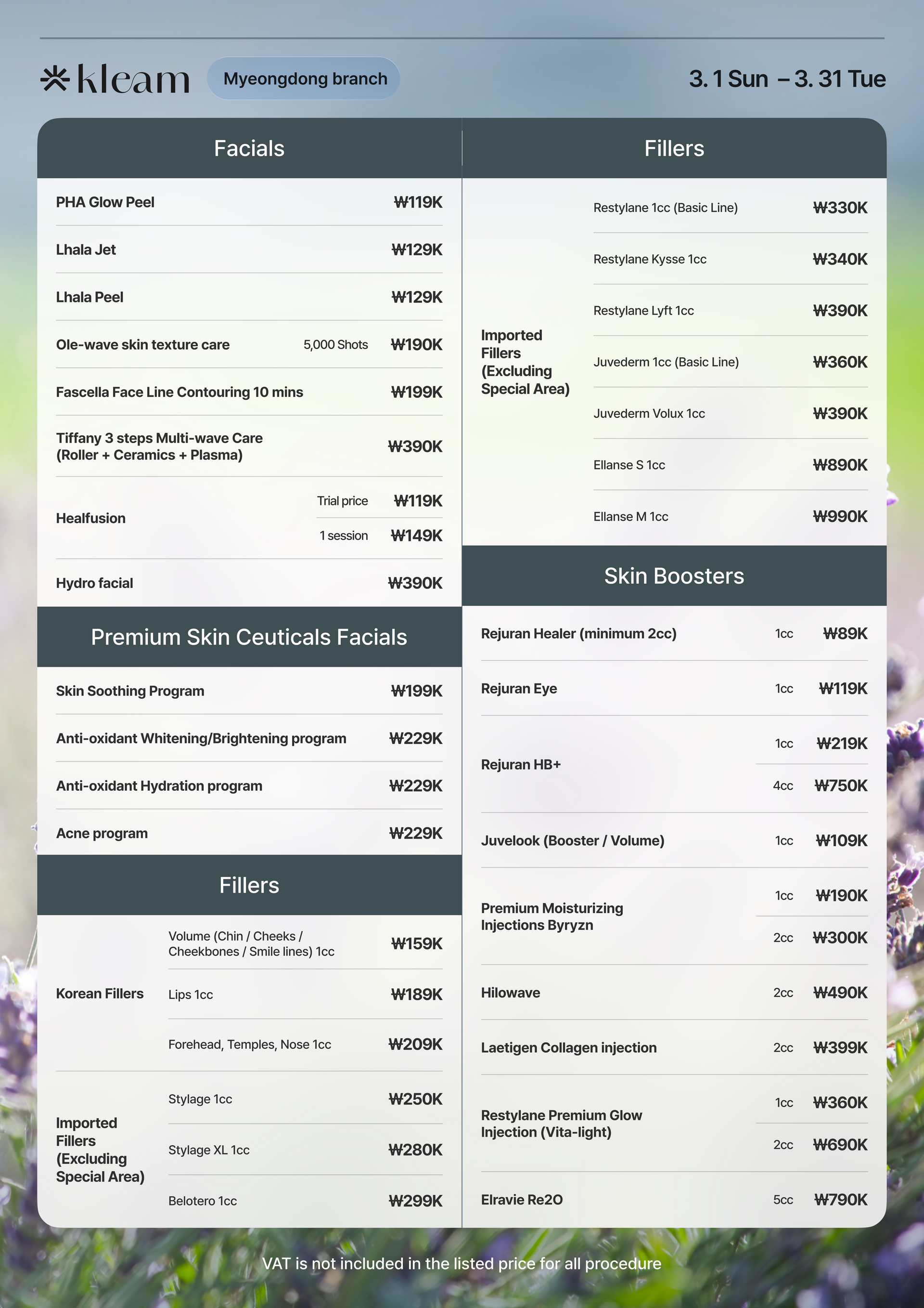 Skinvive, Radiesse, Waterglow Injection, Rejuran Healer, Q-Facial, LDM, Waterdrop Lifting Peel, Mall DM.Cell, Skin Plus Ampoule, Exosome (G-MPF), Lilied M, Juvelook, Chanel Injection, Aqua Shine BTX, Vital Injector 2, Dermashine Balance, Skinbooster Pro, Shining Peel, Oxygen Dome Facial, LED Light Therapy, Calming Care Facial, Hydration Infusion Therapy, Brightening Facial, Sebum Control Facial, Pore Tightening Booster, Moisture Glow Shot, Glutathione IV, Vitamin C Drip, Anti-aging Cocktail Drip, MTS + Ampoule Facial, Gua Sha Facial, High-Frequency Facial, Acne Peel, Enzyme Peel, Milk Peel, Mandeli Clear Peel, Salmon DNA Booster, PolyNucleotide Therapy, 5GF Ampoule Therapy
